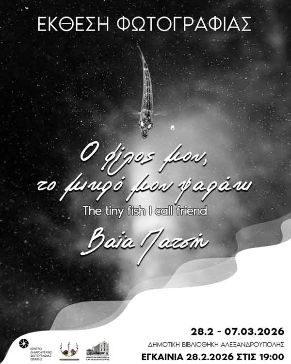 Το Κέντρο Δημιουργικής Φωτογραφίας Θράκης σας προσκαλεί με ιδιαίτερη χαρά στα εγκαίνια της έκθεσης φωτογραφίας «Ο φίλος μου, το μικρό μου ψαράκι», μιας τρυφερής και ποιητικής ενότητας εικόνων που αναδεικνύουν τη μαγεία του φυσικού κόσμου μέσα από τη ματιά της δημιουργού.